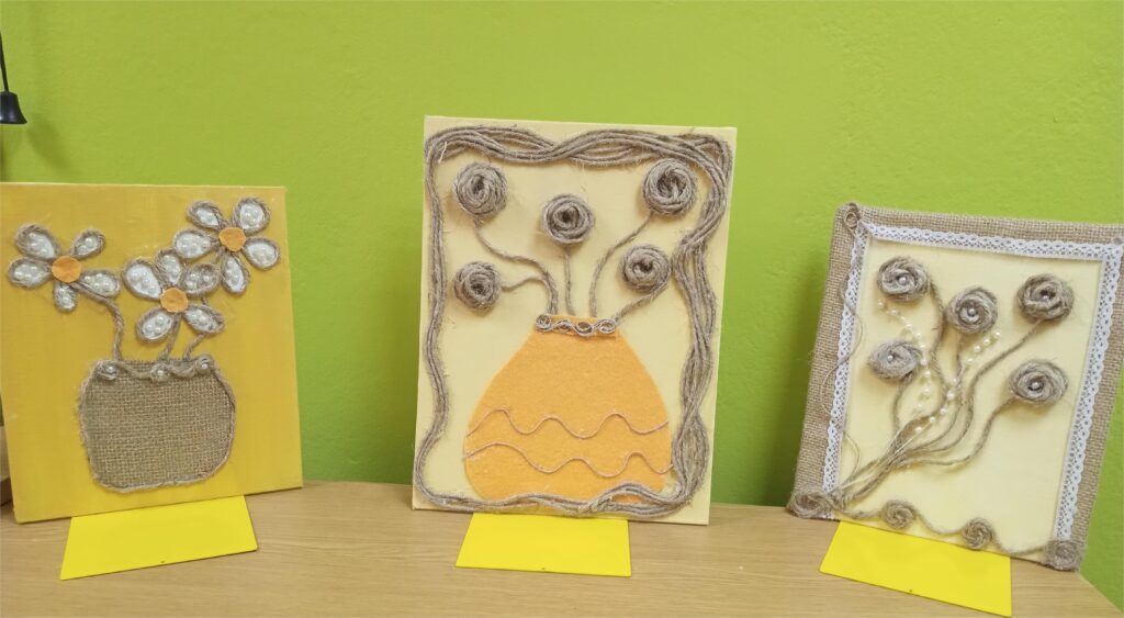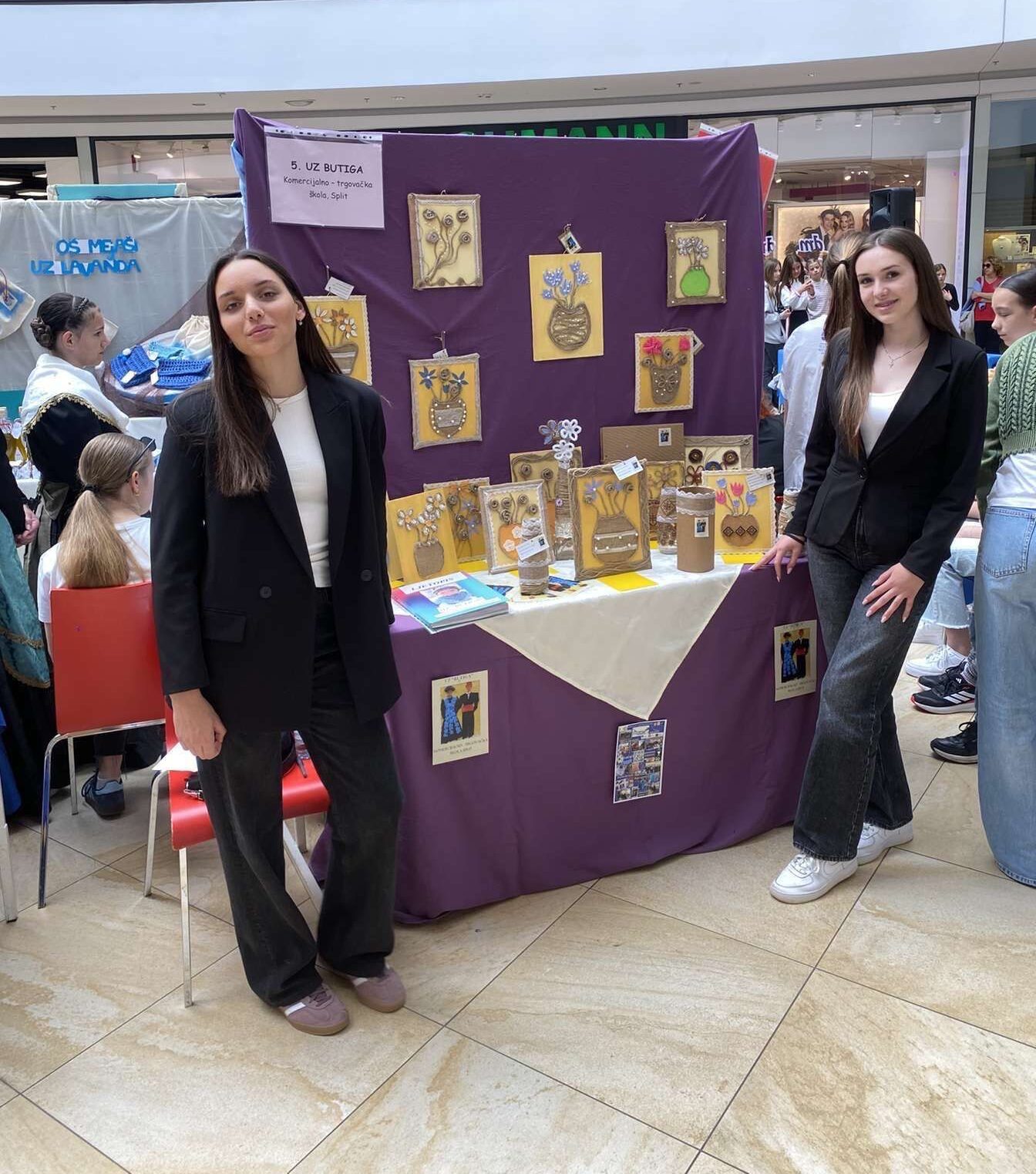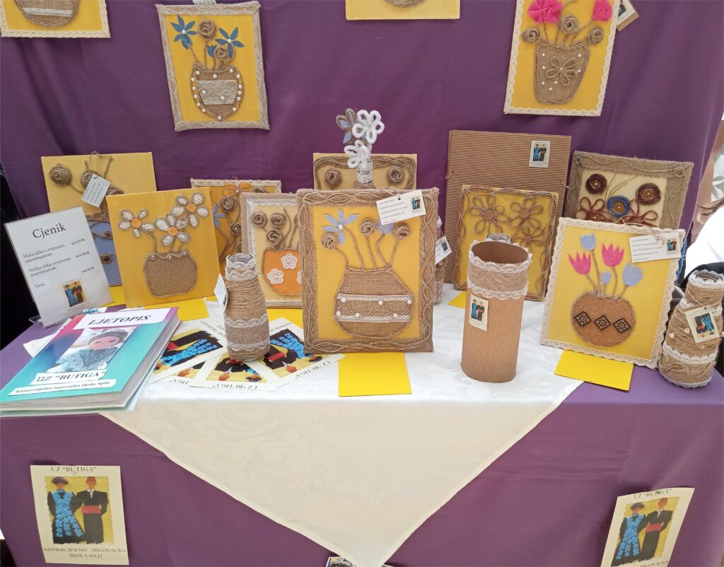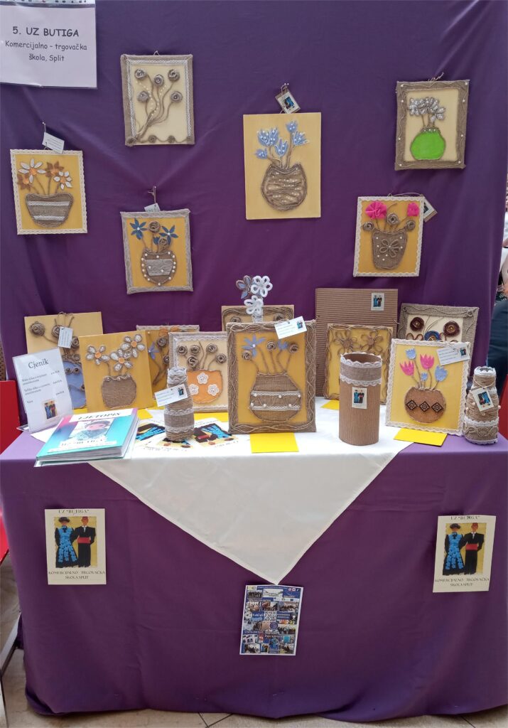Smotra učeničkih zadruga Splitsko–dalmatinske županije održana je u petak 16. svibnja, u prodajnom centru Mall of Split na kojoj je sudjelovalo 36 zadruga. Našu školu predstavile smo mi, učenice 2.a razreda Antea Babić i Emanuela Župa članice UZ Butiga. Za natjecanje nas je pripremala školska knjižničarka Margareta Glavurtić uz pomoć profesorica strukovnih predmeta Duške Grčić i Antonije Slavice. Za Smotru smo izradile cvjetne aranžmane na platnu sačinjene od prirodnih materijala: jute, konopa i pluta obrubljene tradicionalnim hrvatskim pleterom i dekorirane raznobojnim perlicama. U zadružnoj sekciji Izrada ukrasnih i uporabnih predmeta uz cvjetne aranžmane načinili smo i atraktivne eko vaze za suho cvijeće od staklenih boca i konopa. Kreirajući uvijek nove proizvode naučili smo puno o prirodnim materijalima i izradi slika na platnu.