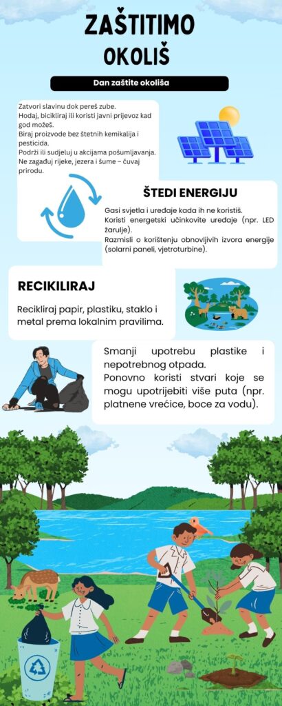Dana 5. lipnja 2025. godine s profesoricama Ivanom Čotom i Marijom Istenić obilježili smo Svjetski dan zaštite okoliša. Ovaj dan, koji se svake godine obilježava diljem svijeta, ima cilj potaknuti ljude na promišljanje o vlastitom utjecaju na planet i motivirati ih na konkretne akcije za očuvanje prirode.