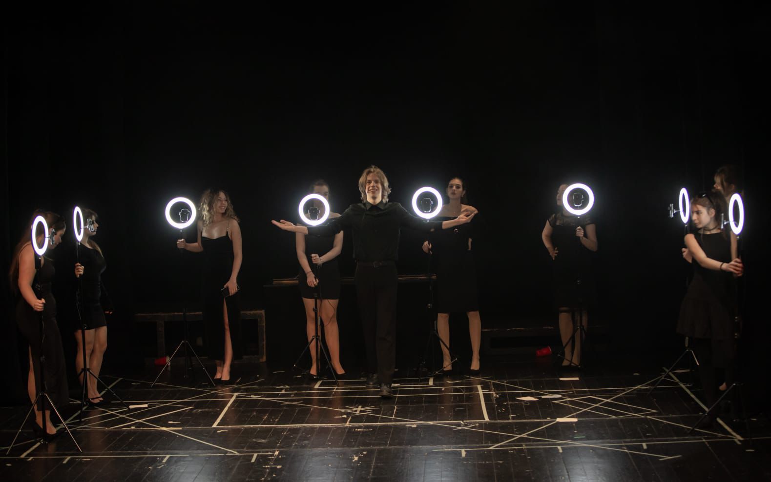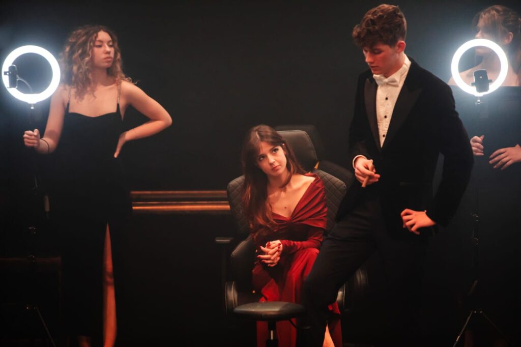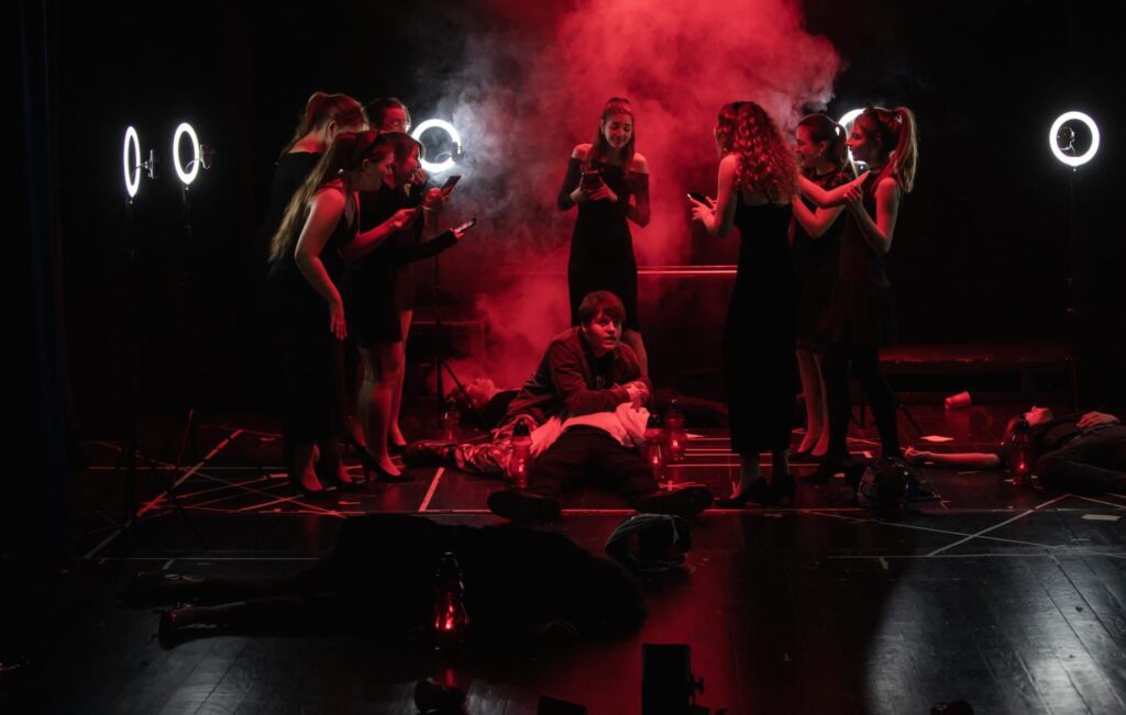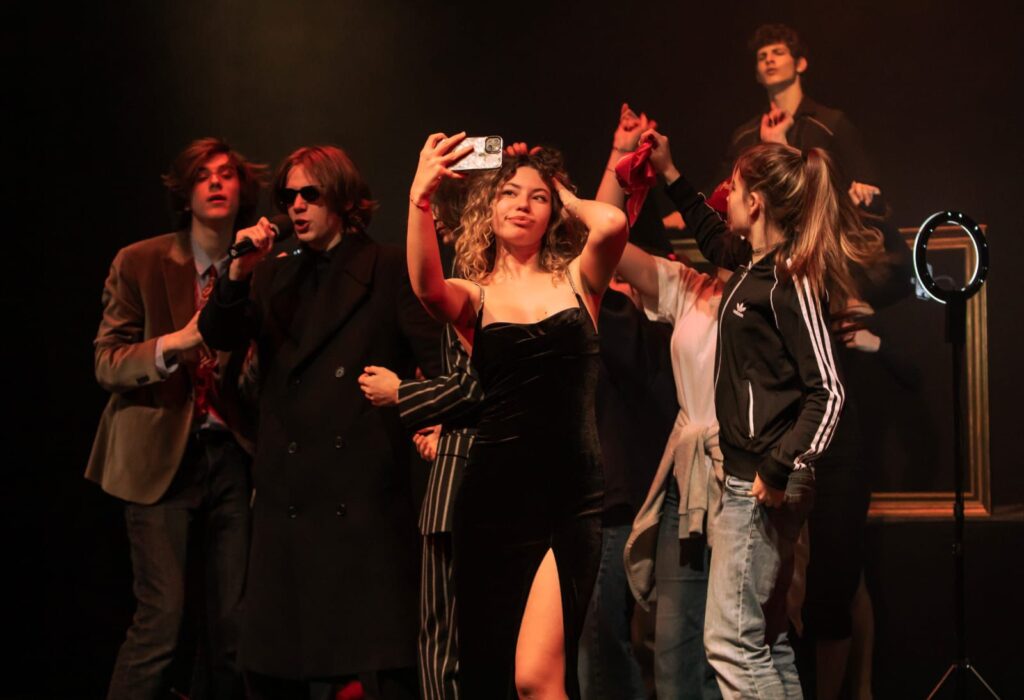 Max: Pa skoro svaka osoba u predstavi služi se mobitelima i drugim društvenim medijima koje u to doba (op. renesansi) nisu bile prisutne. Svi osim Hamleta. Hamlet jednom izvadi mobitel i to samo da bi se rugao mobitelu zapravo.