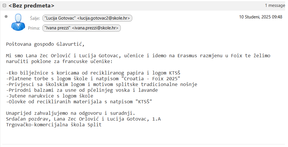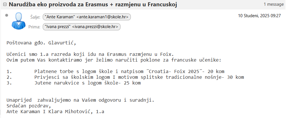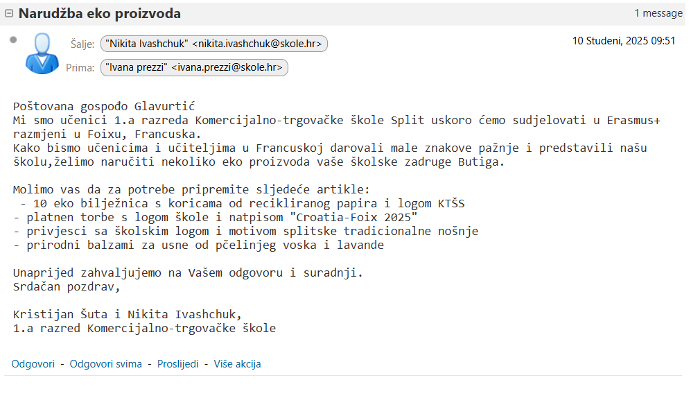 U sklopu modula Poslovne komunikacije, na satu prof. Ivane Prezzi, koristiti smo pravila poslovnog bontona u pisanoj komunikaciji. Koristeći Carnet Zimbra sustav, sastavljali smo i slali poslovni e-mail narudžbe školskoj zadruzi “Butiga”, naručujući ekoproizvode koje će trećaši i maturanti ponijeti kao poklone na Erasmus+ mobilnost u Foix, Francuska. U radu smo primijenili pravila poslovnog bontona u pisanju e-maila, pazili na stil, ton i pravopisnu točnost te pokazali kako se poslovna komunikacija može vježbati kroz stvarnu situaciju.