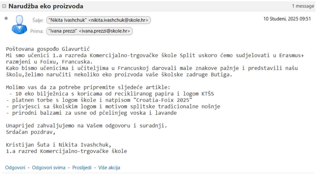 U sklopu modula Poslovne komunikacije, na satu prof. Ivane Prezzi, koristiti smo pravila poslovnog bontona u pisanoj komunikaciji. Koristeći Carnet Zimbra sustav, sastavljali smo i slali poslovni e-mail narudžbe školskoj zadruzi “Butiga”, naručujući ekoproizvode koje će trećaši i maturanti ponijeti kao poklone na Erasmus+ mobilnost u Foix, Francuska. U radu smo primijenili pravila poslovnog bontona u pisanju e-maila, pazili na stil, ton i pravopisnu točnost te pokazali kako se poslovna komunikacija može vježbati kroz stvarnu situaciju.
