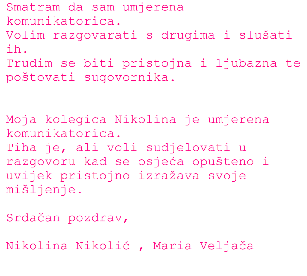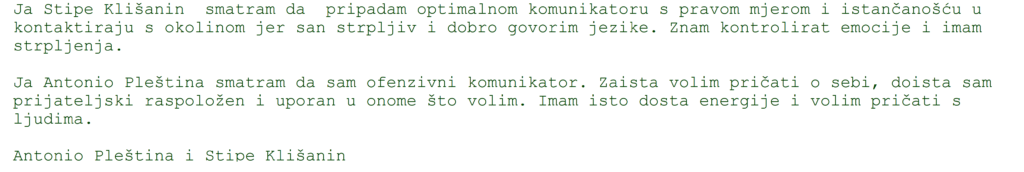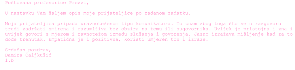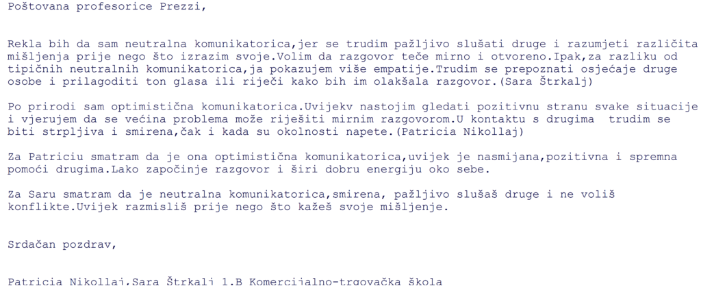 Na predmetu Uvod u poslovne komunikacije s nastavnicom prof. Ivanom Prezzi učili smo o bontonu u razgovoru i otkrivali koji smo tip komunikatora – povučeni, uravnoteženi, umjereni ili dominantni. Radili smo u paru, opisivali sebe i kolegu te vježbali kulturan dijalog, aktivno slušanje i neverbalnu komunikaciju.